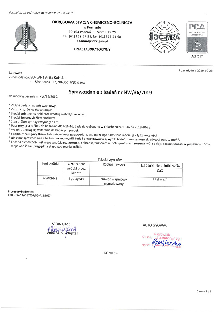 Suplagran – nawóz wapniow0 - węglanowy CaCO3 ok. 90%.