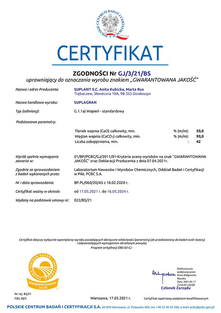 Zaawansowana technologicznie granula o równym uziarnieniu, gwarantuje przemyślane i optymalne uwalnianie wapna w glebie, idealnie z zapotrzebowaniem. Zastosowanie nawozu SUPLAGRAN w formie granulatu pozwala w miarowych odstępach czasu odżywić roślinę w niezbędny wapń, co przyczynia się do wydatnego wzrostu plonu. Wyniki badań wykazały, że stosowanie nawozu wapniowego przyczynia się do wzrostu plonów średnio nawet o 20-30%. Nawóz ten jest nośnikiem niezbędnego dla prawidłowego wzrostu roślin wapnia w najczystszej dostępnej postaci.