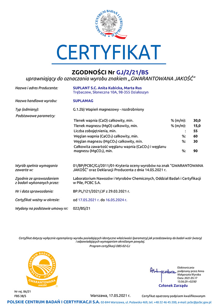 Suplamag - nawóz wapniowo-magnezowy jest nawozem pochodzenia naturalnego uzyskiwanym z mielonego dolomitu surowego. Nawóz ten jest nośnikiem niezbędnych dla prawidłowego wzrostu roślin składników, głównie magnezu i wapnia. Nawozy wapniowo-magnezowe odkwaszają glebę i równocześnie uzupełniają ją w mikroelementy. Ze względu na znaczna zawartość CaO ok. 30% - 35%, MgO do 16% zaleca się stosowanie wapna  przede wszystkim na glebach o niskiej i bardzo niskiej zasobności tego składnika.