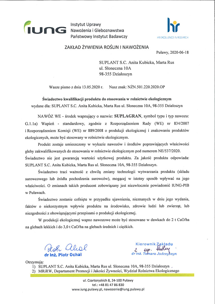 Suplagran – nawóz wapniow0 - węglanowy CaCO3 ok. 90%.