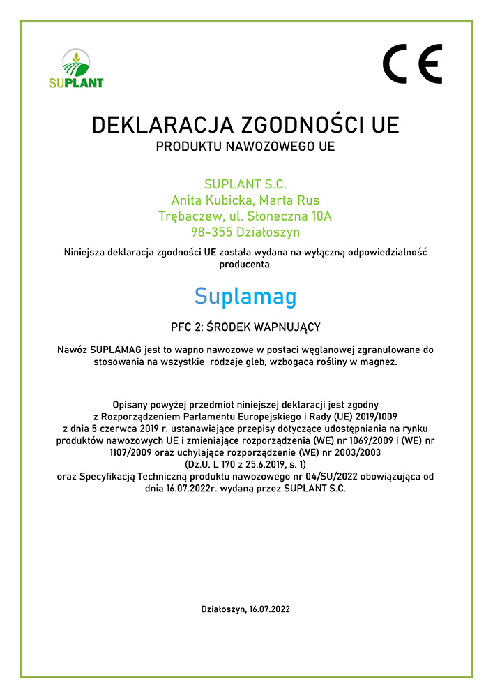 Suplamag - nawóz wapniowo-magnezowy jest nawozem pochodzenia naturalnego uzyskiwanym z mielonego dolomitu surowego. Nawóz ten jest nośnikiem niezbędnych dla prawidłowego wzrostu roślin składników, głównie magnezu i wapnia. Nawozy wapniowo-magnezowe odkwaszają glebę i równocześnie uzupełniają ją w mikroelementy. Ze względu na znaczna zawartość CaO ok. 30% - 35%, MgO do 16% zaleca się stosowanie wapna  przede wszystkim na glebach o niskiej i bardzo niskiej zasobności tego składnika.